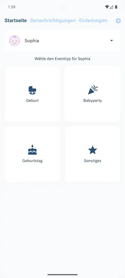 Lege dein Event an (Geburt, Babyparty oder Geburtstag) und wähle einen Namen für dein Baby.