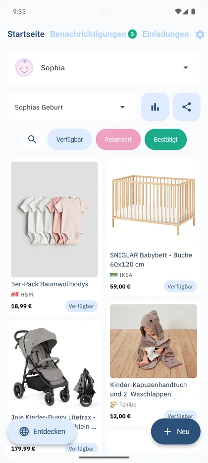 Du kannst Listen für verschiedene Anlässe erstellen: Geburt, Babyparty, Geburtstag des Kindes oder andere besondere Anlässe. Jede Liste wird unabhängig verwaltet.